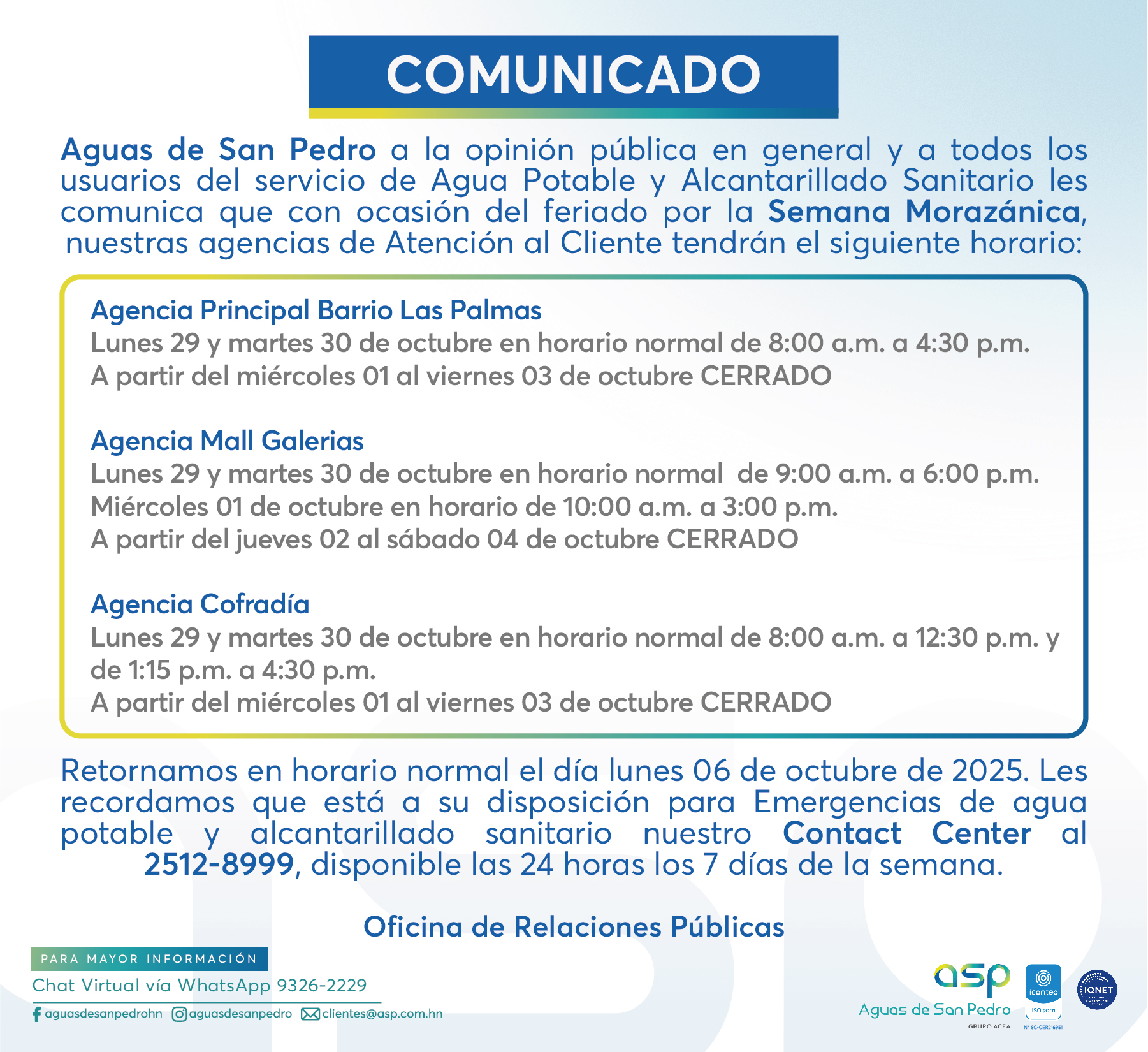 COMUNICADO: HORARIOS DE AGENCIAS DE SERVICIO AL CLIENTE POR FERIADO DE LA SEMANA MORAZÁNICA