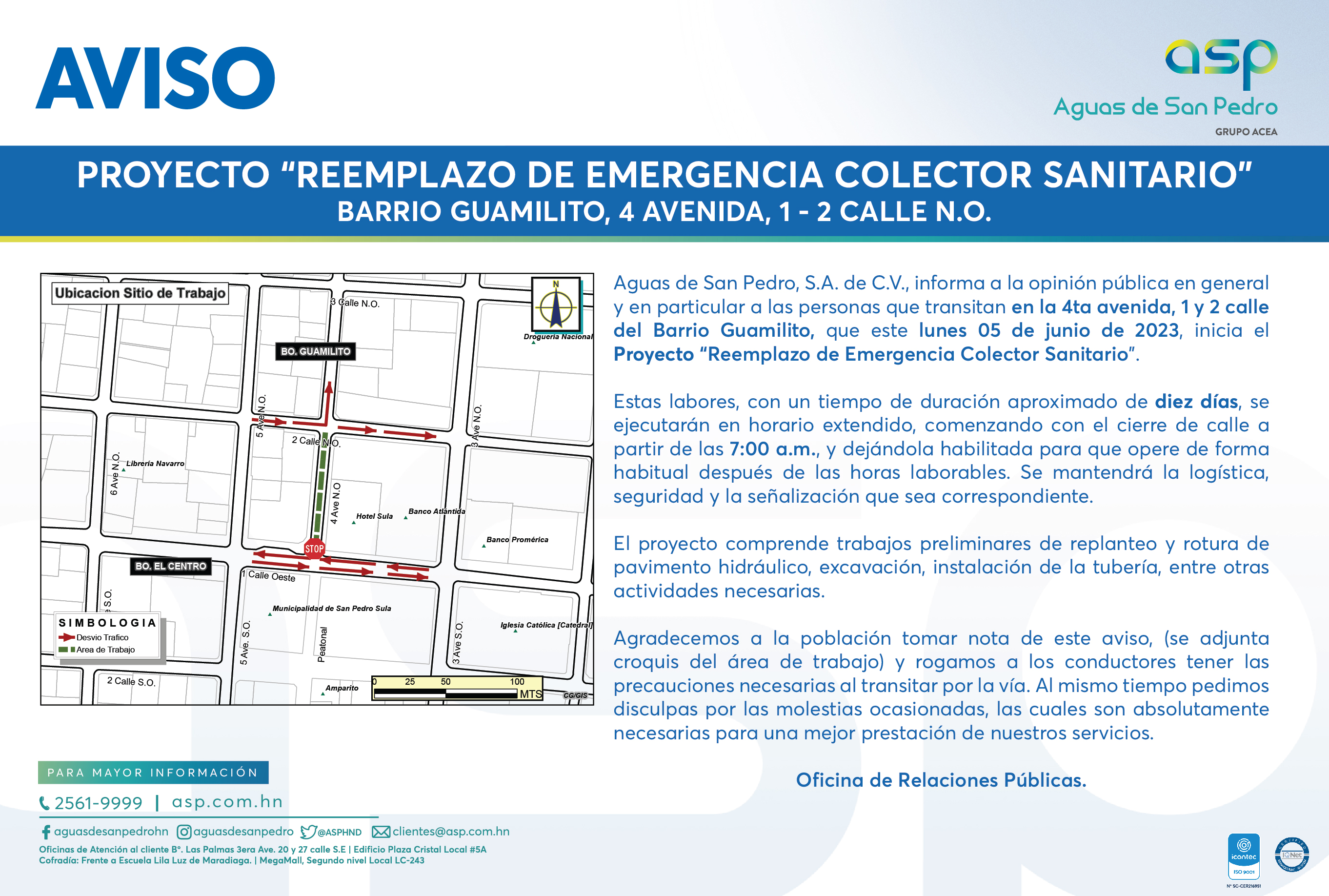 PROYECTO DE EMERGENCIA "REEMPLAZO COLECTOR SANITARIO 1RA CALLE, 13 Y 14 AVENIDA S.O."