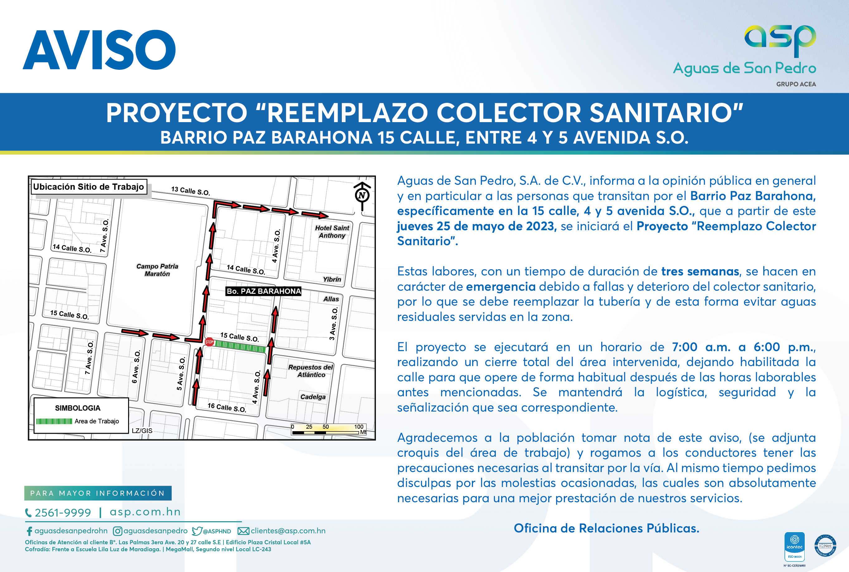 PROYECTO DE EMERGENCIA "REEMPLAZO COLECTOR SANITARIO" BARRIO PAZ BARAHONA, 14-15 CALLE, 7 AVENIDA S.O.