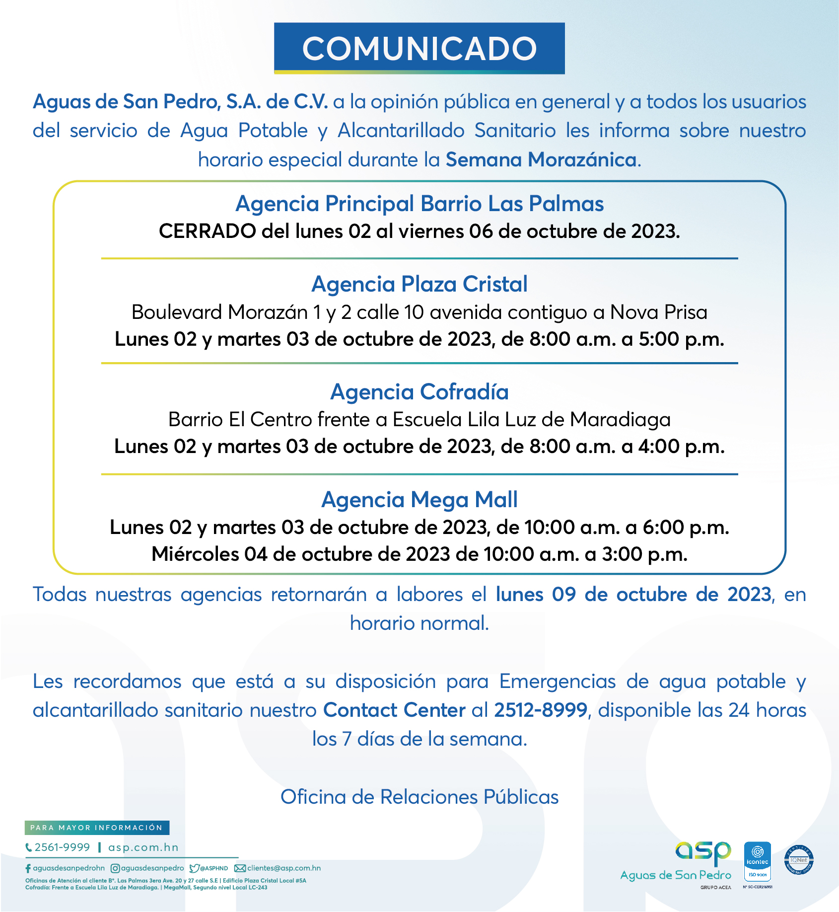 COMUNICADO: HORARIOS DE AGENCIAS DE SERVICIO AL CLIENTE POR FERIADO DE LA SEMANA MORAZÁNICA